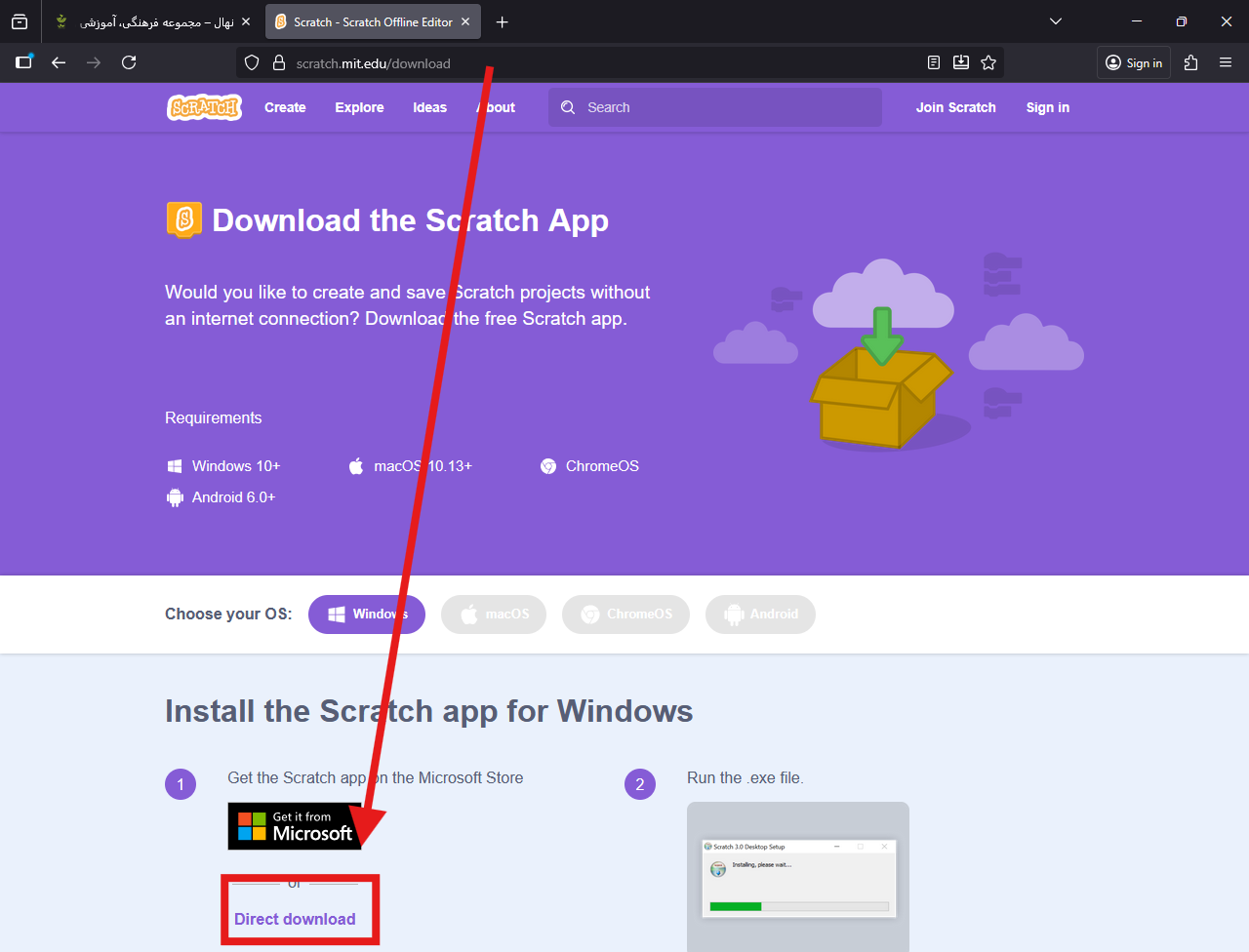 مرحله دوم: روی گزینه دانلود اسکرچ مطابق تصویر کلیک کنید
